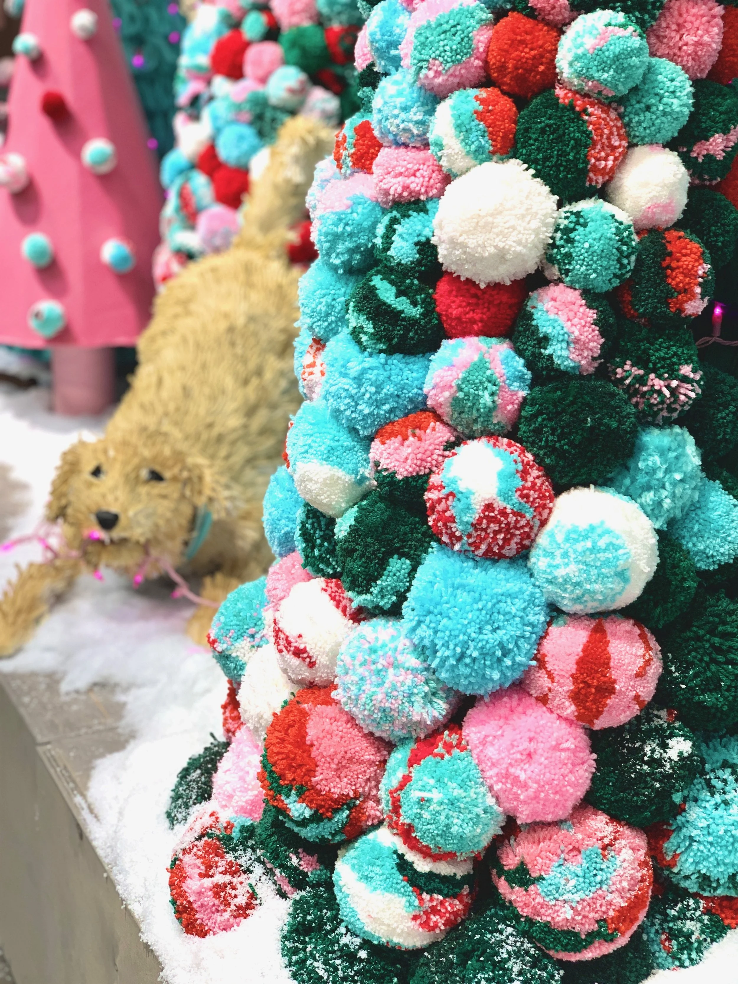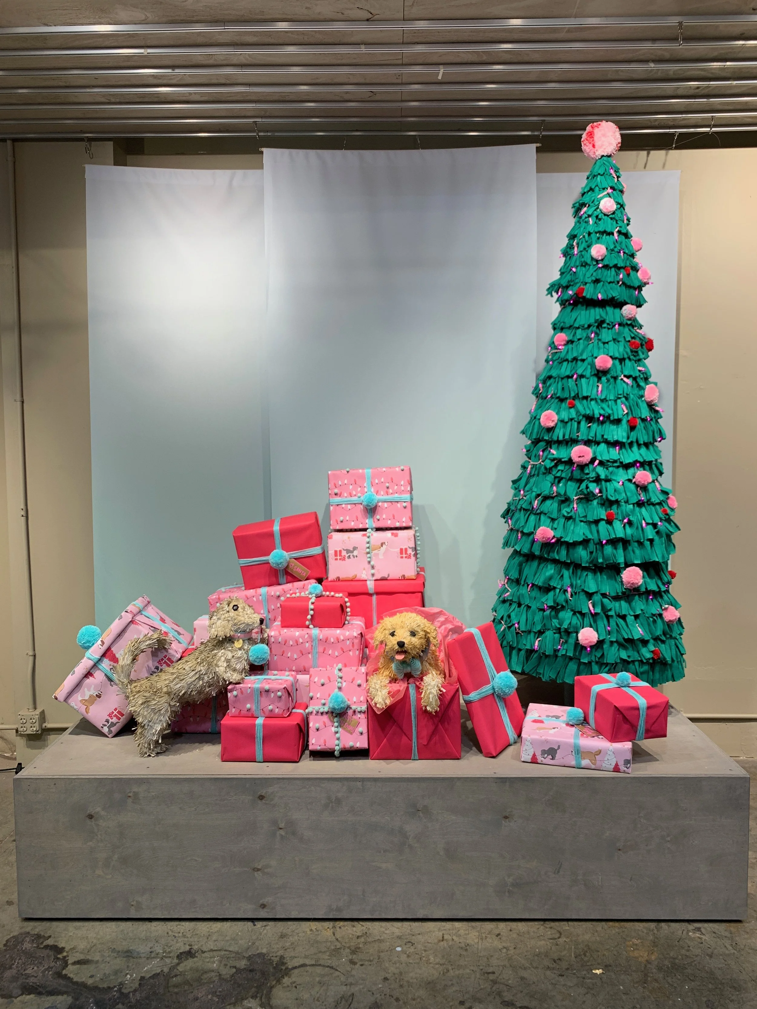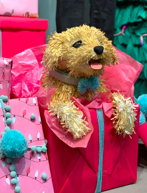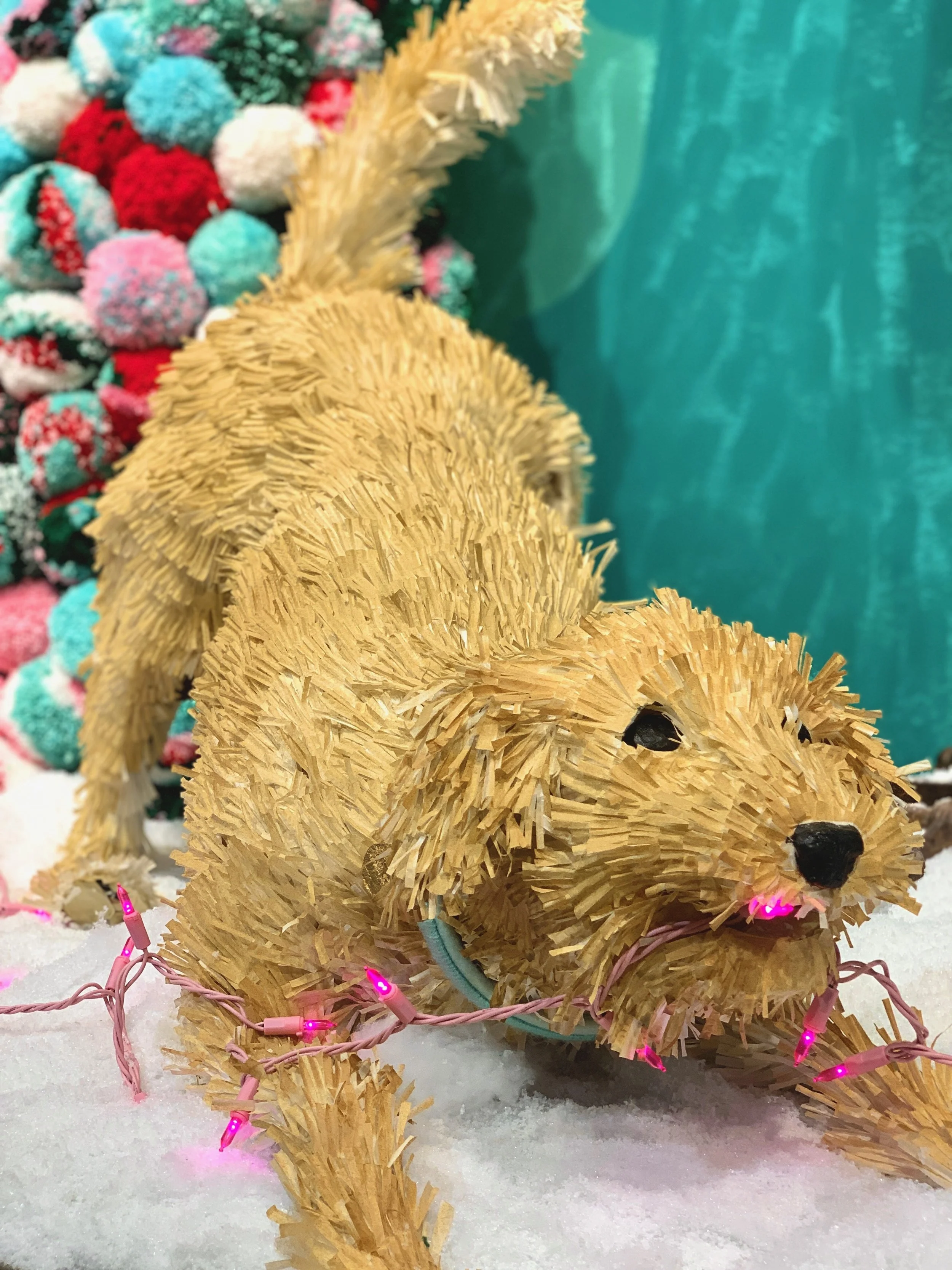 The feliz naughty dogs for this display were sculpted from chicken wire, paper and masking tape. Their fur was created from cut cupcake wrappers. I made each pup a special collar out of cardboard and yarn with a little gold-leafed tag.