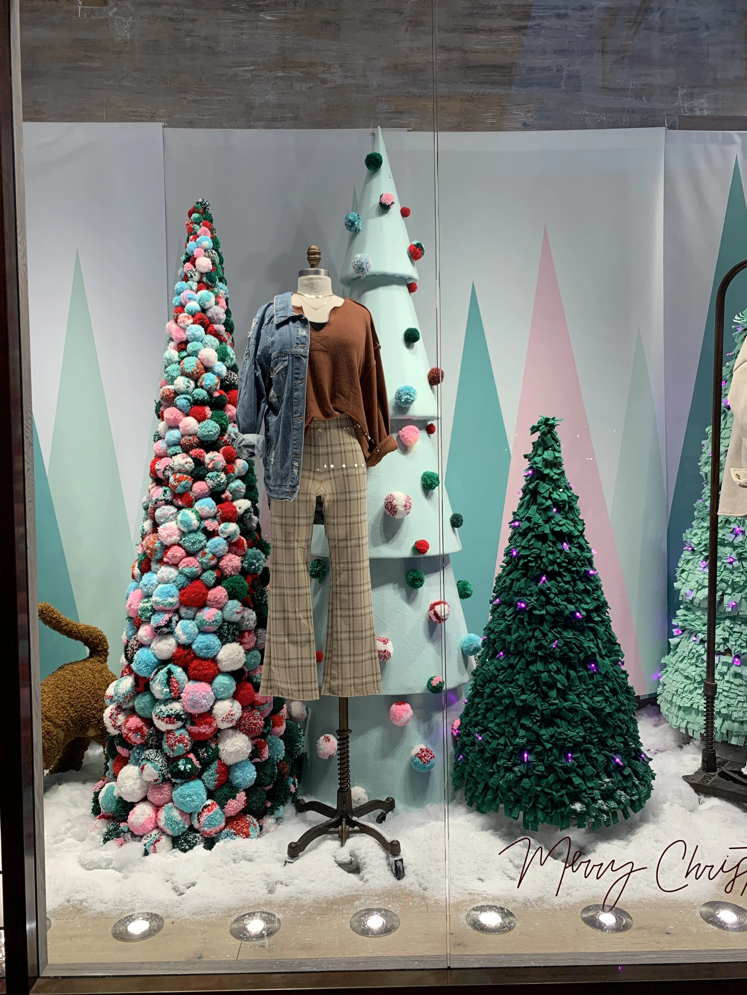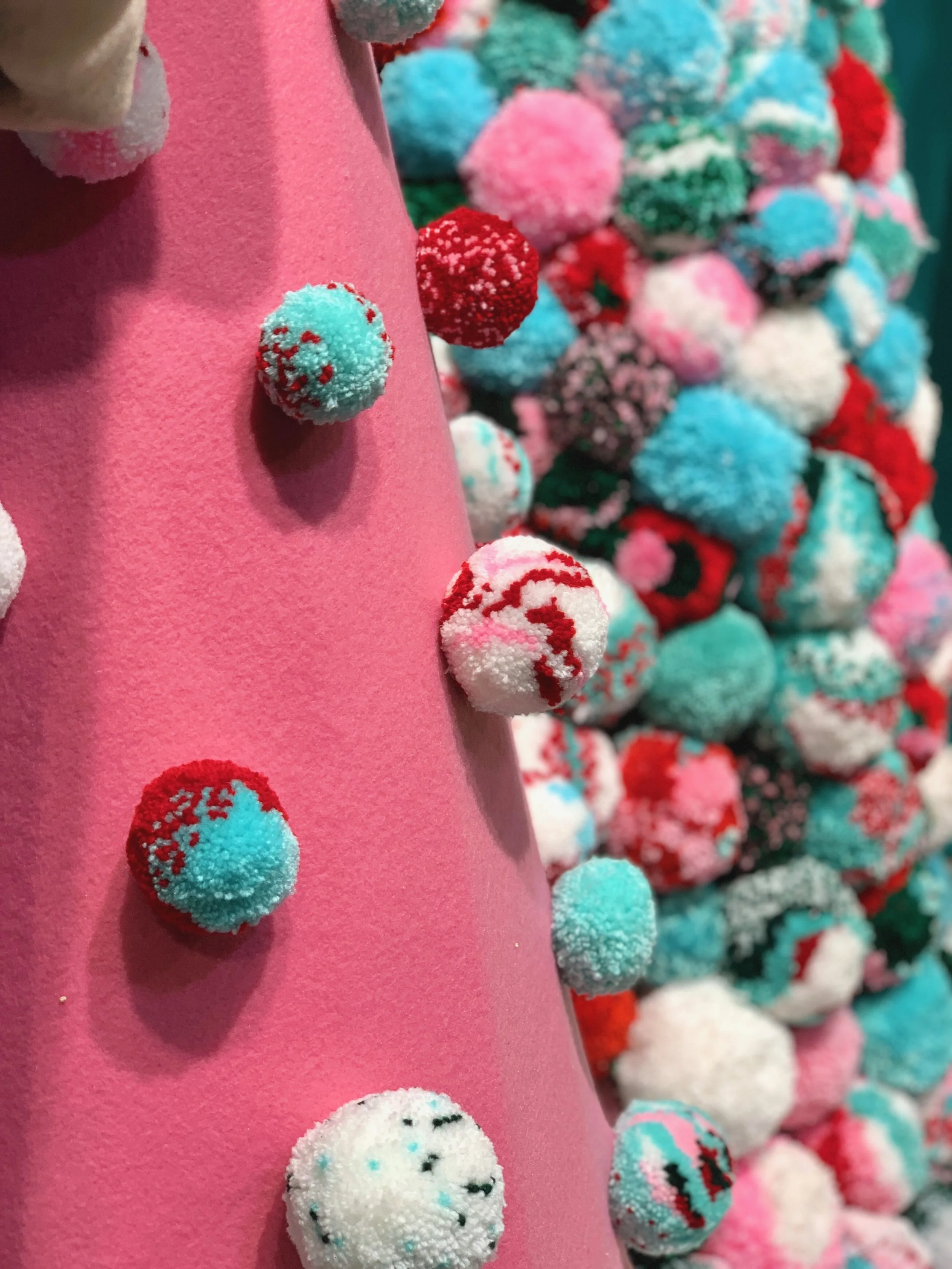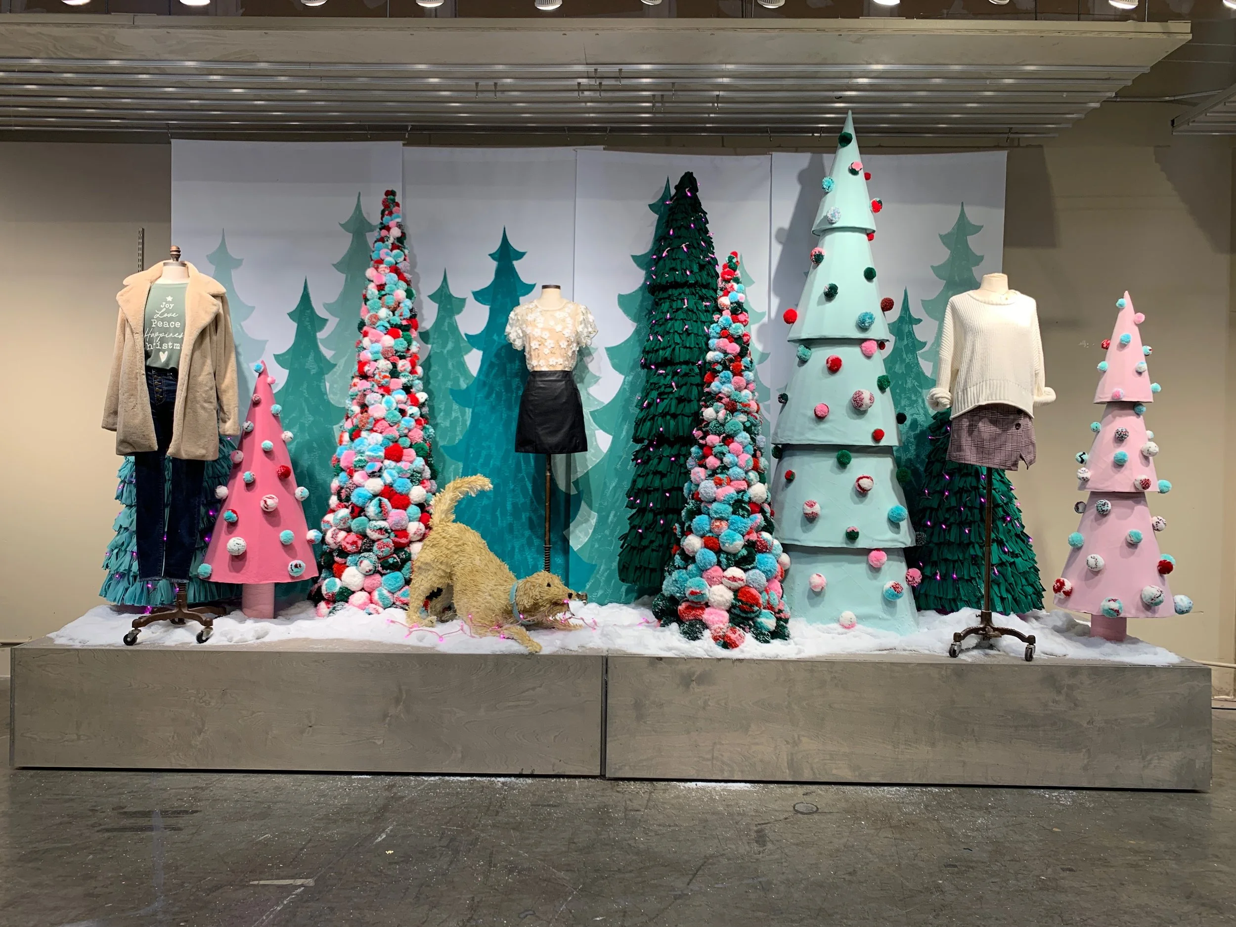 The feliz naughty dogs for this display were sculpted from chicken wire, paper and masking tape. Their fur was created from cut cupcake wrappers. I made each pup a special collar out of cardboard and yarn with a little gold-leafed tag.