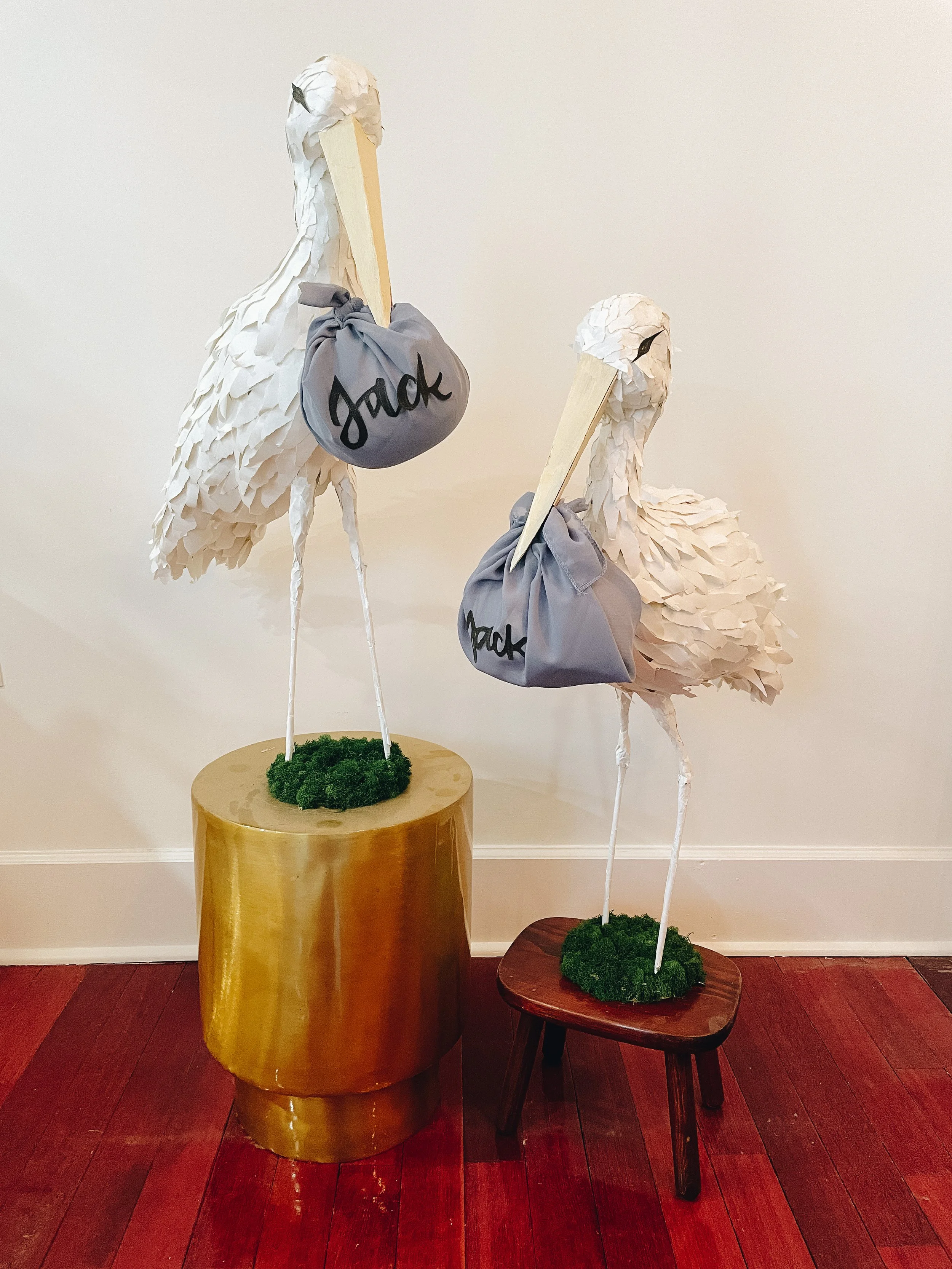 Each stork is made from hand-sculpted chicken wire, masking tape, and paper. I hand-ripped each feather from watercolor paper and laid them down with hot glue.
